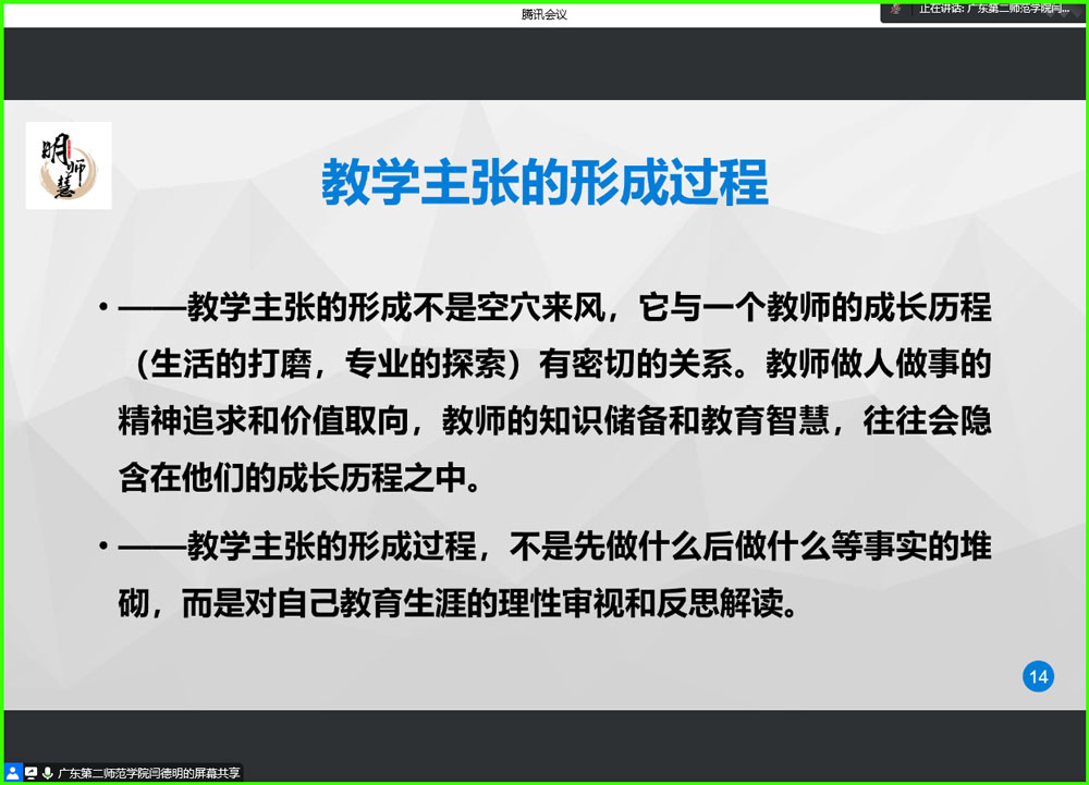 2022年11月30日,首届青年教师领军人才培养对象齐聚线上,参加了由中山市教师发展中心组织的《‘我的教学主张与实践’文稿的修改意见》会议,围绕培养对象提出的教学主张开展研讨和打磨。活动邀请了广东省第二师范学院闫德明教授作了题为《关于教学主张的几点思考》的讲座并作指导,中山市教师发展中心教师培训部陈少芳部长、蒋太路老师参加会议。